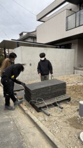 アプローチに据える石材を現場で確認してきました。打ちっぱなしコンクリートの壁と、玄武岩の質感。素材そのものの表情が、建築を引き立てる外構になります。仕上がりが楽しみな現場です☺️